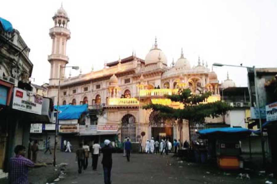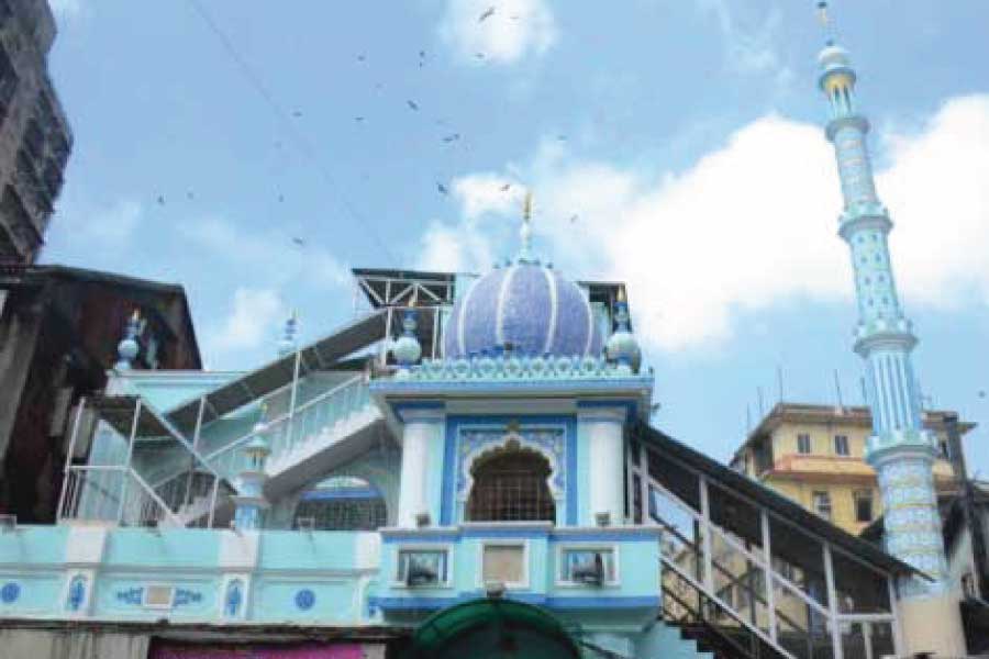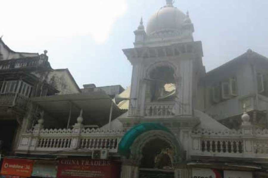 Bapu Khote Street, near metal market known as Jamli Mohalla. This mosque has four marble plaques called Kutbas , with couplets in URDU & PERSIAN language stating date of construction & quoting the name of Late philanthrophist Moahmmad Ali Roghay who contributed for its construction. It has a beautifully carved palpit & mehraab (Imaam’s standing place). Its administration & control is with members of local Kokni Muslim Jamat.